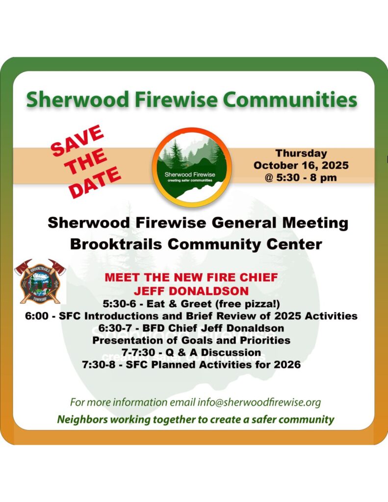 Join us to meet the new Brooktrails Fire Chief and get the latest news from Sherwood Firewise!